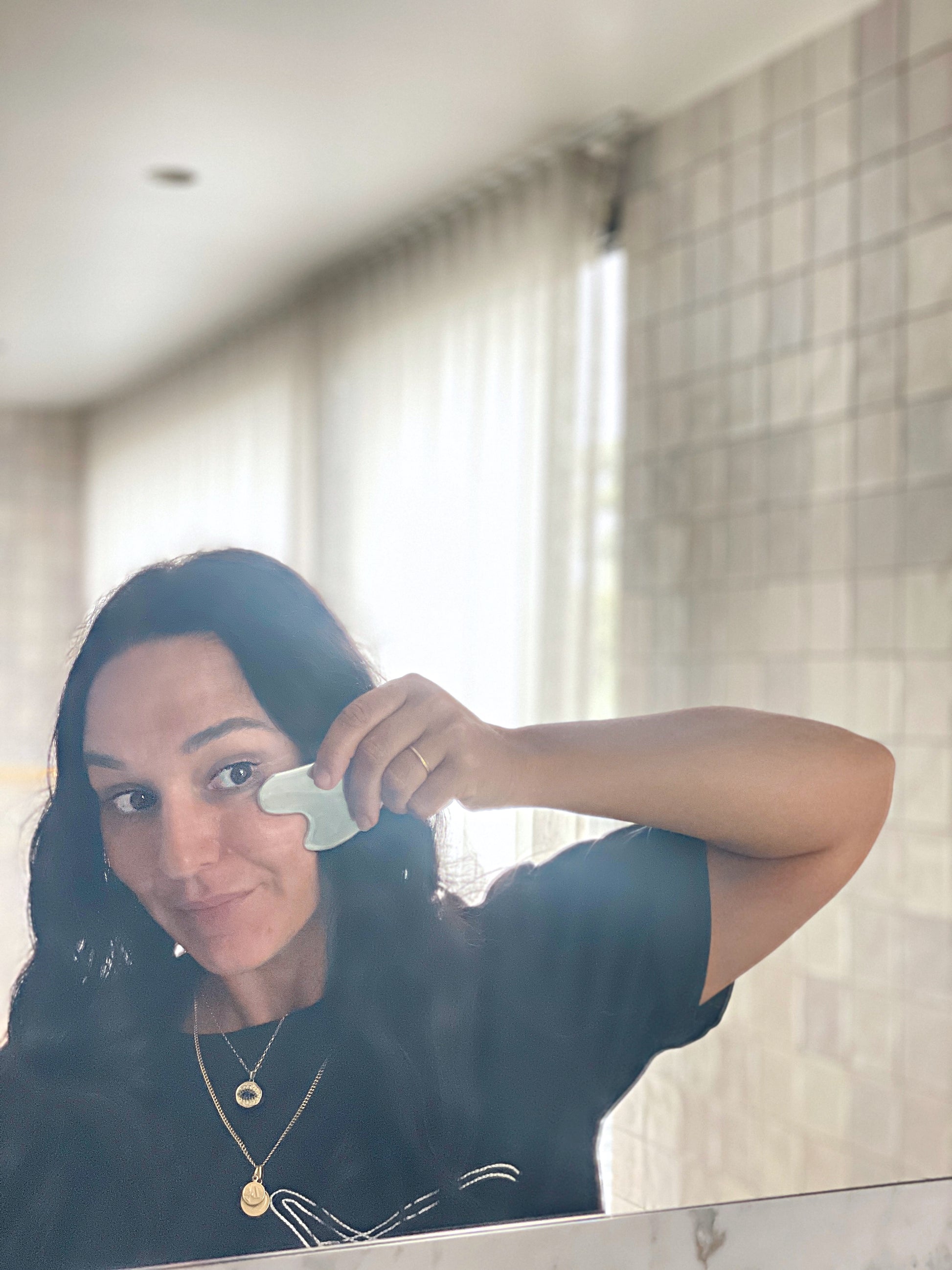 - Gua Sha Massage: Next, use the gua sha tool to massage the face and body. Hold the tool at a slight angle and gently scrape along the contours of your face, following the natural curves and lines. Apply light to medium pressure as needed.