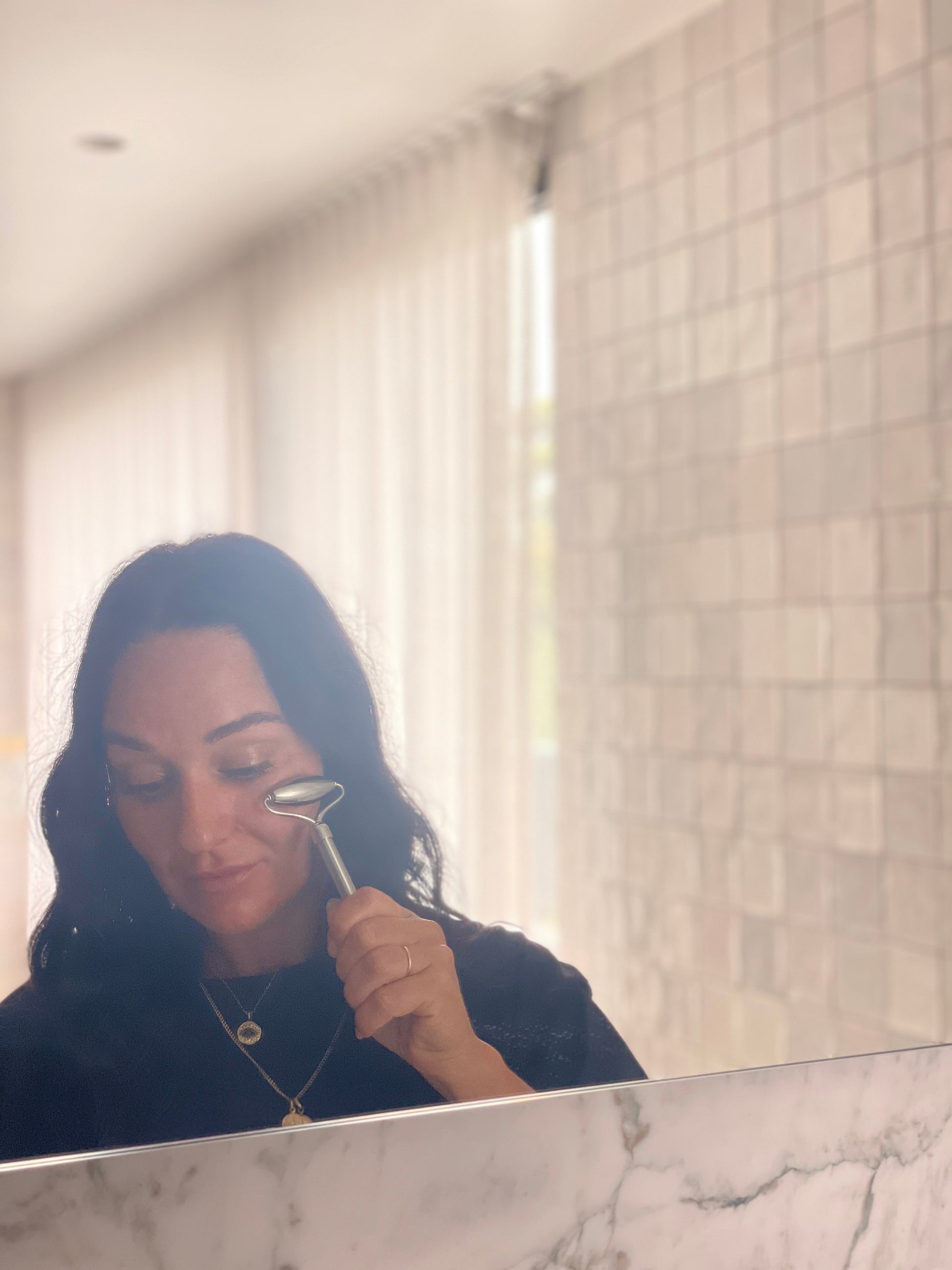 - Facial Rolling: Using the facial roller, gently glide the larger roller across your face in an upward and outward motion. Start from the centre of your face and move towards the hairline, focusing on areas prone to puffiness or tension.